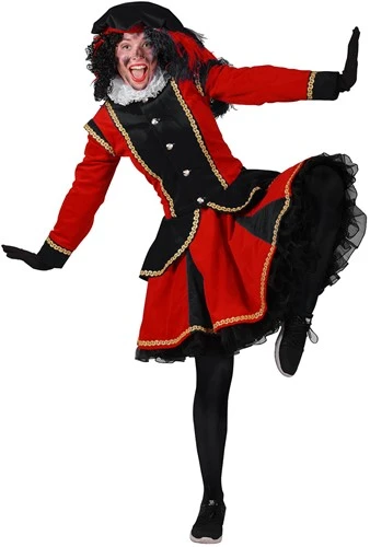 Een mooi zwart met rood pietenkostuum voor dames, het pak is afgewerkt met goudband en is van hoogwaardige kwaliteit. Ideaal voor de intocht van Sinterklaas of voor pakjesavond uiteraard!